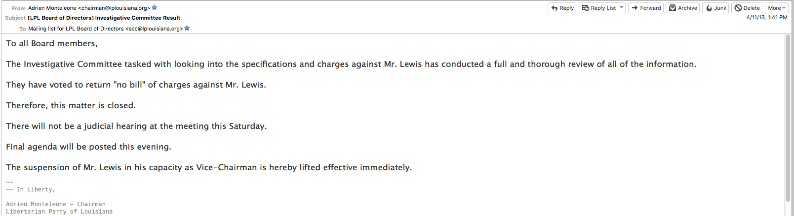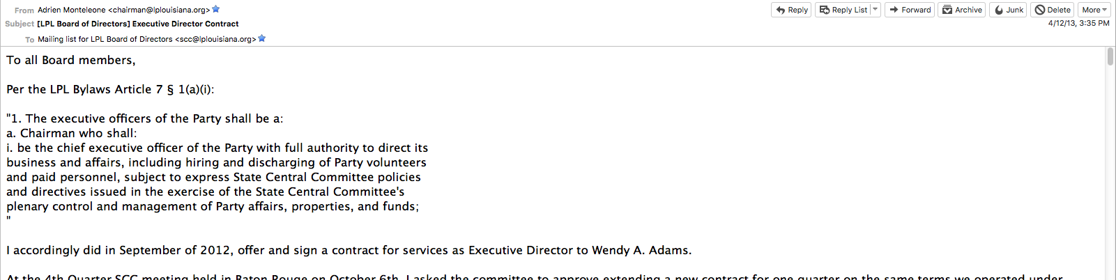 Below there are a series of screen caps that show the chronology of events. Mr Lewis Suspension lifted. This was followed by our Secretary Mr Reed Ebarb suddenly resigning the following day. The announcement of the NOT hiring again of the wildly popular executive director. The chairman announcing the meeting cancelled and then tendering his own resignation. As Mr Ebarb and Mr Monteleone had led that witch hunt, It was clearly retaliation against the board. This was the 2nd time Mr Monteleone had resigned from a position of leadership suddenly. He had resigned after failing to get Bob Barr on the ballot in La. As to Mr. Monteleone’s claims of lack of money. I had pledged $2000 to help fund the effort and two members had pledged $1000 each, along with a lot of smaller amounts. Also note that Ms Adams was hired as an independent contractor. Mr. Monteleone was probably violating the definition of and IC by attempting to tell Ms Adams how to accomplish her job instead of simply what to accomplish as her job. When she started forming Parish Executive Committees, Ms Adams was getting much praise and I think there may have been some jealously. Either way she worked for over 2 years after this under multiple contract renewals.