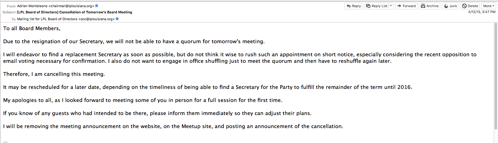 > Without the Secretary, the LPL was unable to have quorum. This plays a