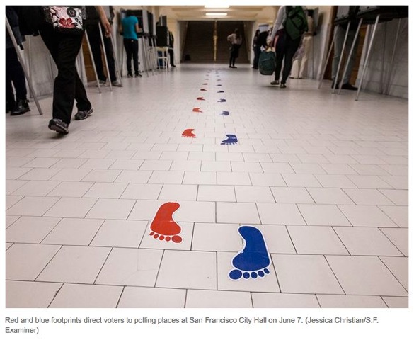 > P.P.S. – Visiting City Hall yesterday to testify before the Ethics Commission, I confirmed that the footprint stickers seen below are currently out again in the polling area in the basement of the building, although they have been arranged in a less problematic manner than shown in the Examiner photo.