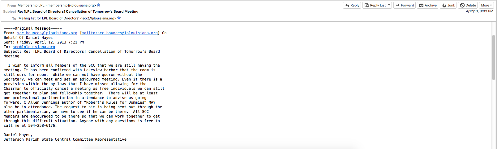 Without the Secretary, the LPL was unable to have quorum. This plays a major role later in this email. I had been elected to the LPL board at a local caucus on 4/04/13 and we had a LPL SCC meeting on 4/13/13.